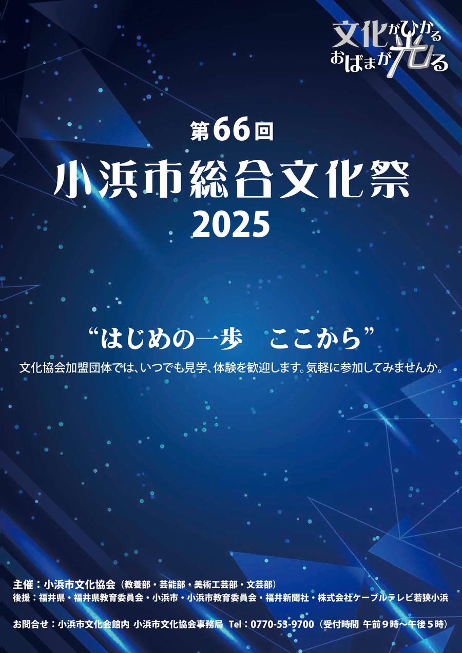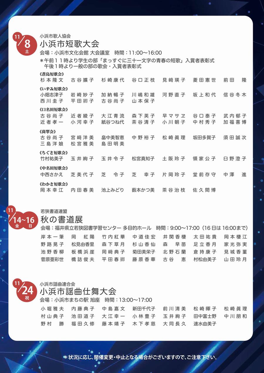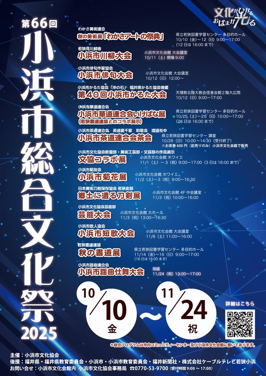 日ごろ、文化活動において活躍されている文化協会所属団体の成果を披露する「小浜市総合文化祭」を市内各所で開催します。ぜひ、芸術の秋、文化の秋をご堪能ください。
