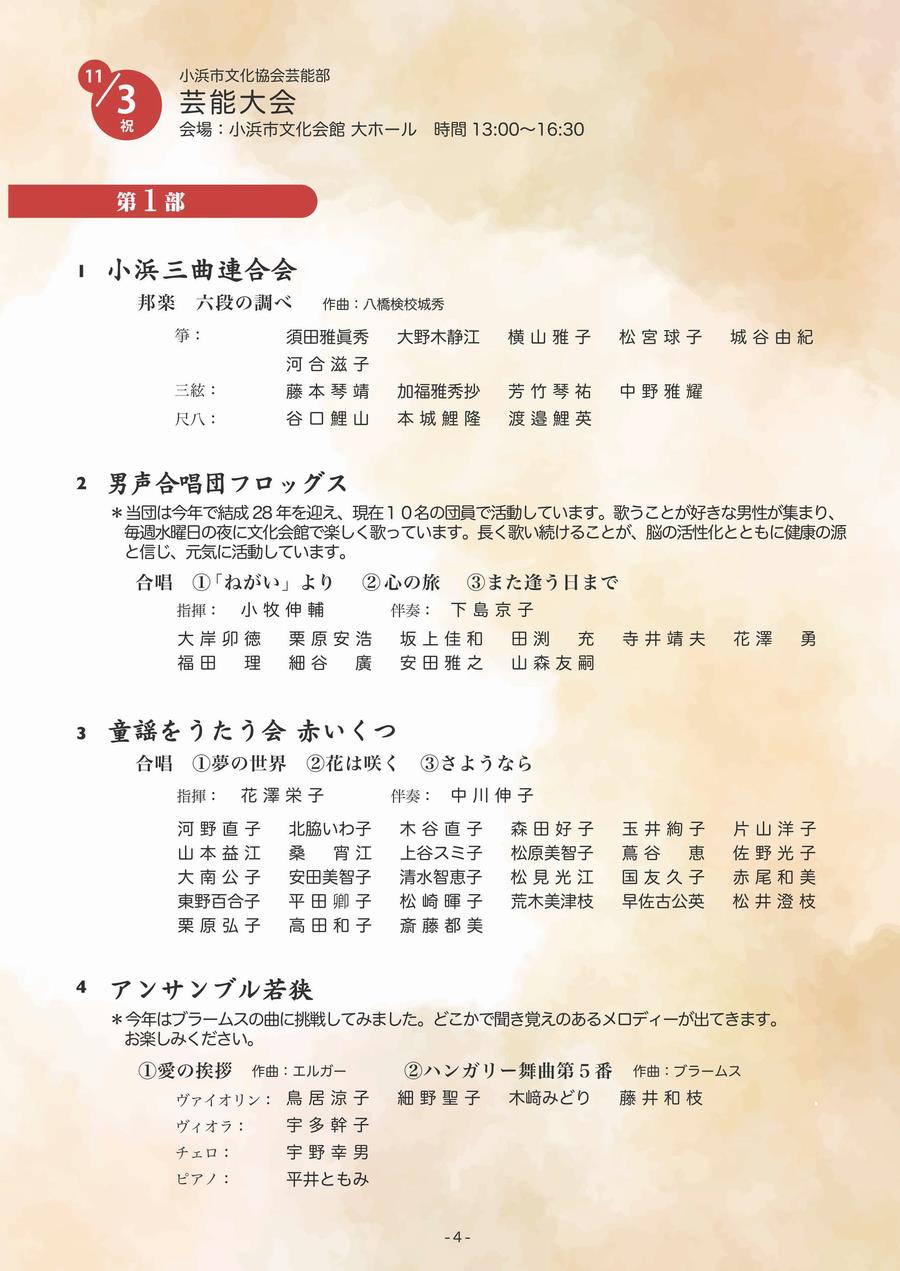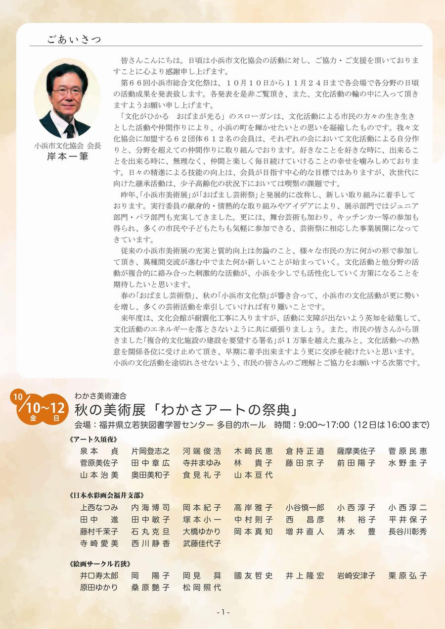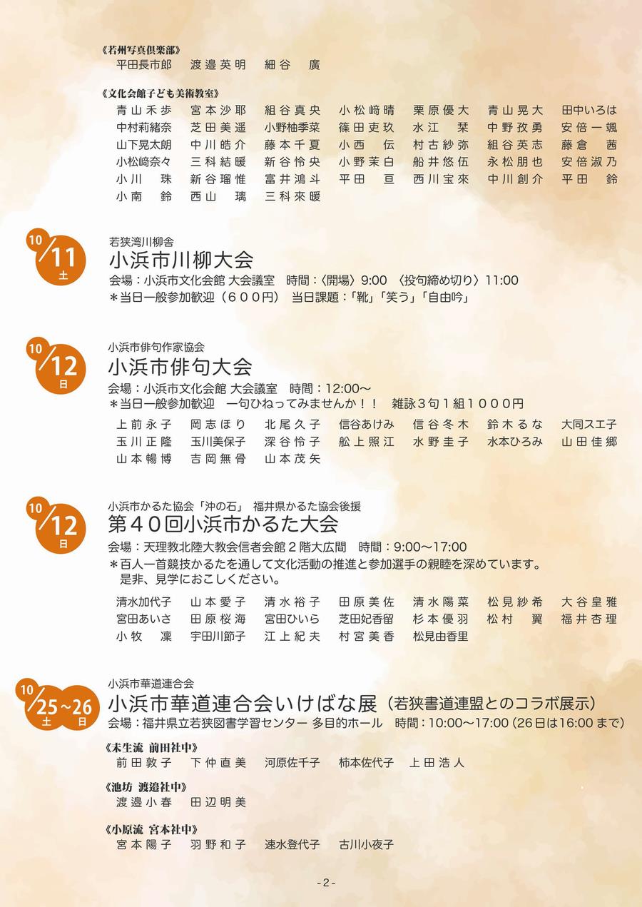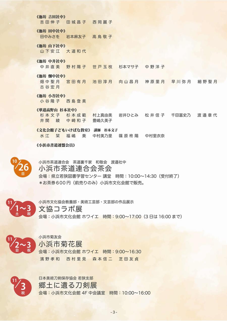日ごろ、文化活動において活躍されている文化協会所属団体の成果を披露する「小浜市総合文化祭」を市内各所で開催します。ぜひ、芸術の秋、文化の秋をご堪能ください。