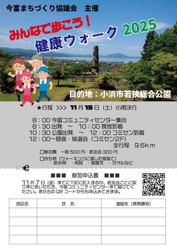 今回は10km近い行程になりますので、体調万端でご参加ください。昼食付で豪華な(?)抽選会もありますので、ご近所・ご家族お誘いあわせの上お越しください!